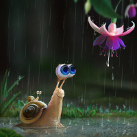 a pink flower that has fallen from its stem onto the ground. In the background, it appears to be raining heavily, and there are droplets falling on the ground. This scene is likely from one of the "Alice in Wonderland" movies or a similar animated