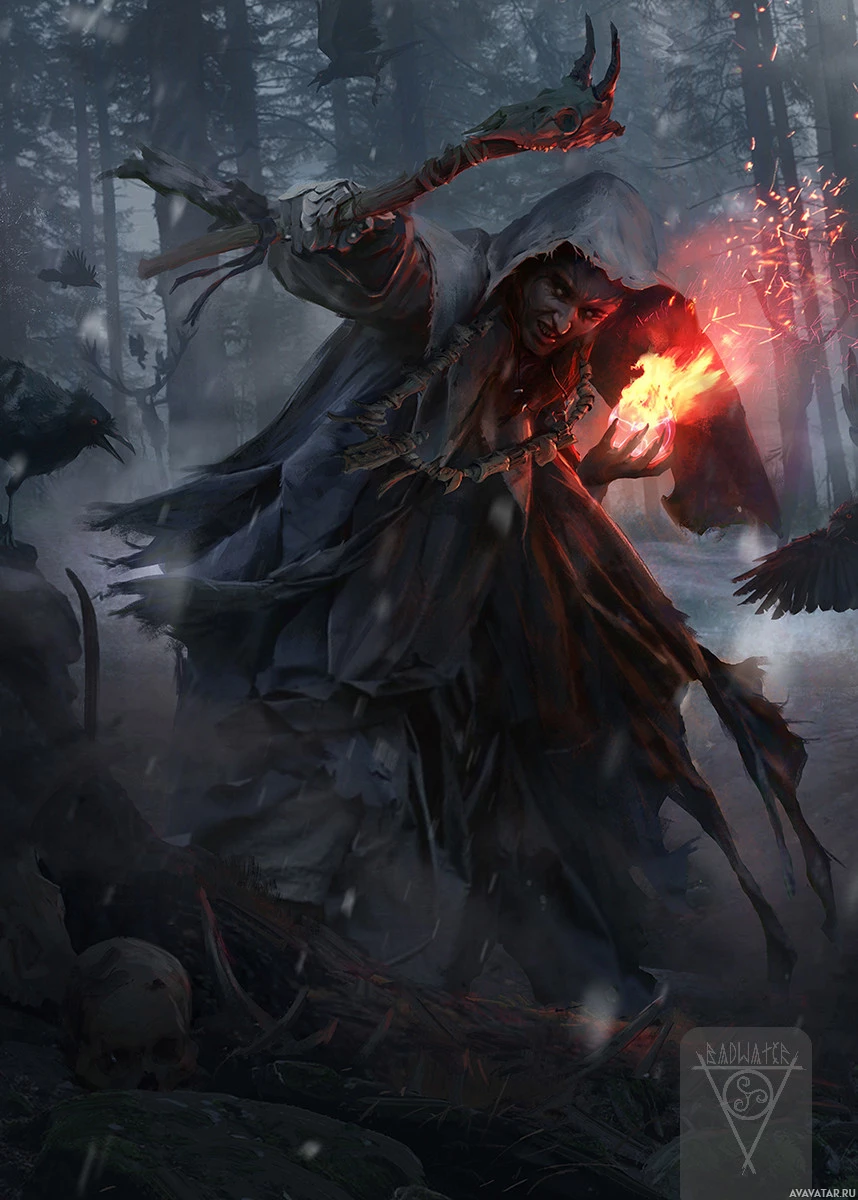 a fantasy scene featuring a figure that appears to be a witch or a sorceress. She is dressed in dark, medieval-style clothing and is holding a staff with what seems to be