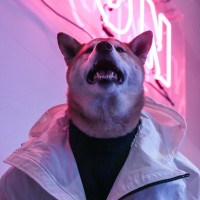 The image shows a dog wearing a jacket and standing in front of a sign. The dog appears to be of the Shiba Inu breed, which is known for its distinctive fox-like features and