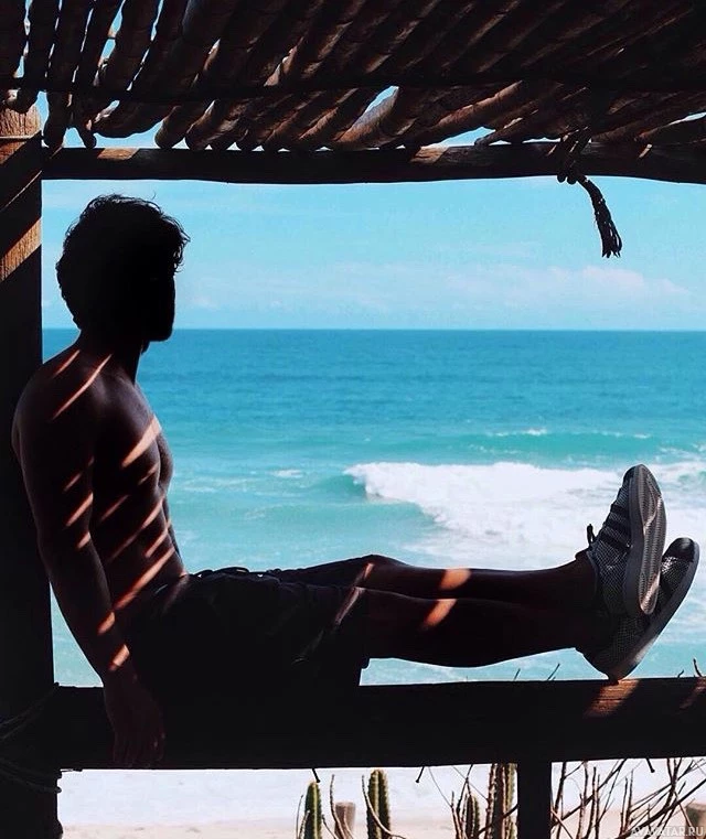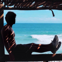 a wooden structure, possibly a deck or pier, overlooking the ocean. The individual is facing away from the camera and looking out towards the sea. There's a clear