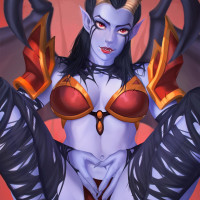 dark hair, horns, and demonic characteristics like wings and claws. She's wearing armor with