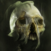 The image shows a skull with a detailed and eerie appearance. It has prominent teeth, large eye sockets, and a somewhat