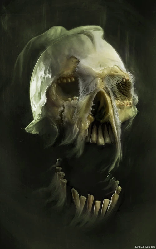 menacing expression. There's an impression of decay or age on the bones, and the overall