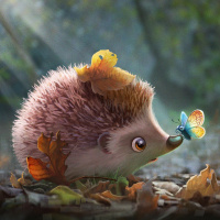 large eyes, which give it a friendly and cute appearance. In front of the hedgehog, there is a butterfly with vibrant orange and
