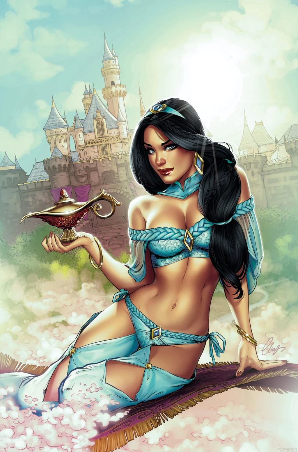 an animated character named Jasmine, known for her role in the Disney animated movie "Aladdin." She is depicted in her iconic blue and gold outfit, sitting on a rock with a lamp in her hand, which signifies her