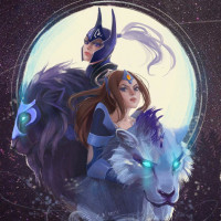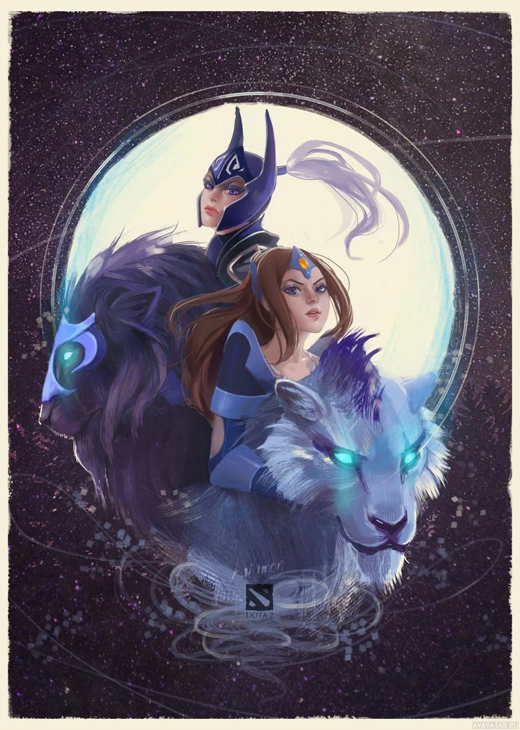 The image features two characters from the game Dota 2. On the left is Mirana, a character known for her ability to transform into a bear and wield a bow. On the right is Luna, who is also associated with animal forms, as she can transform into