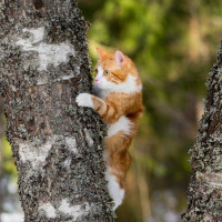 tabby cat sitting on the trunk of a birch tree. The cat appears to be scratching or rubbing against the bark, which is