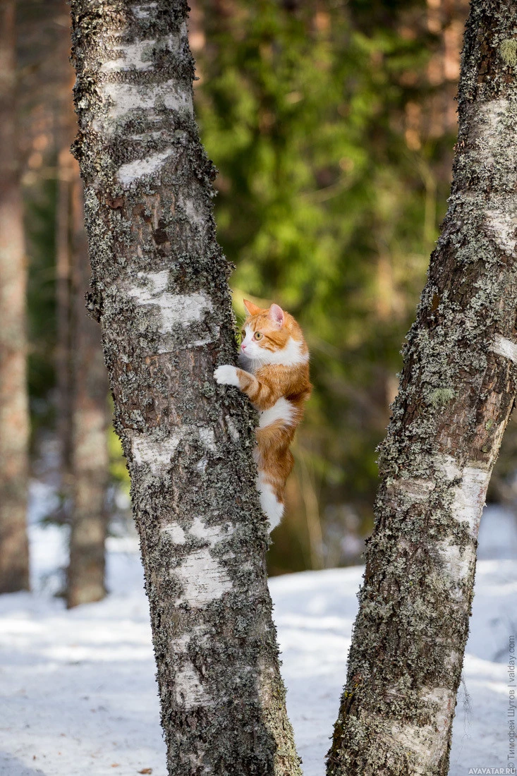 common behavior for cats as they use it to mark their territory and satisfy their natural instincts. The background includes other trees with snow on the ground, suggesting that this scene might be taking place during wintertime in