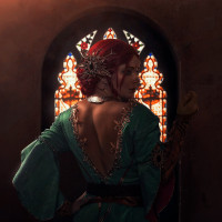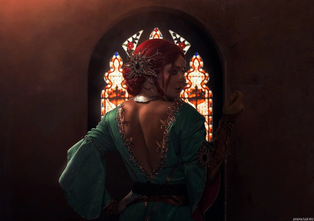 The image features a person dressed in cosplay attire, portraying the character of Triss Merigold from "The Witcher"