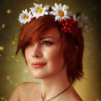 red hair and visible tattoos. She is wearing what appears to be a flower crown or tiara, possibly a cosplay accessory representing the character Shani from "The Witcher"
