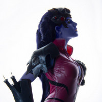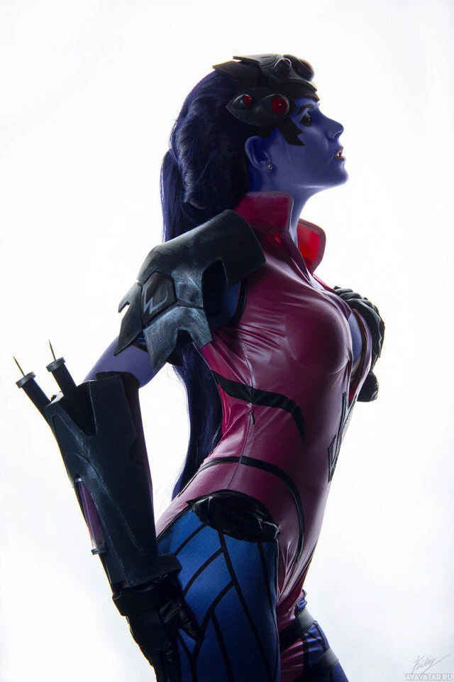 The image features a cosplay of Widowmaker, a character from