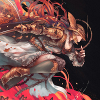 a powerful figure. The art style is highly detailed, with a focus on fantasy elements and