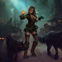 The image features a female character who appears to be in a fantasy setting. She is standing in the center of the frame, with two wolves at her feet. The background suggests an eerie or magical environment, possibly a forest or a battlefield. The character is wearing armor and holding what looks like a staff or wand. The overall atmosphere conveys a sense of danger and fantasy.