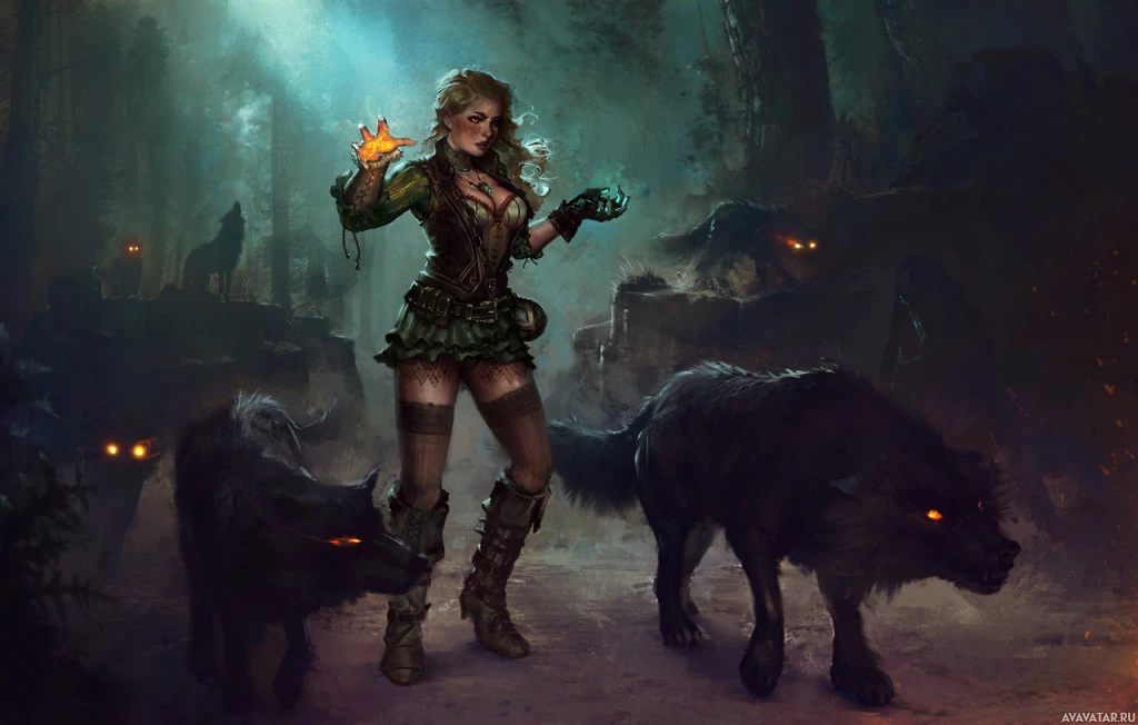 Картинка показывает женский персонаж, который, кажется, находится в фантастической обстановке. Она стоит в центре кадра, у ее ног два волка. Фон предполагает жуткую или волшебную среду, возможно, лес или поле битвы. Персонаж носит доспехи и держит то, что выглядит как посох или палочка. Общая атмосфера передает ощущение опасности и фэнтези.