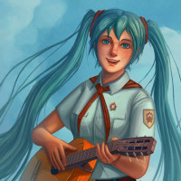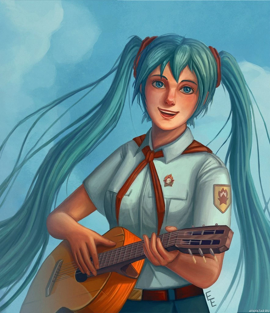 an animated character with turquoise hair, wearing a uniform with badges and holding a guitar. This character is known for being associated with the "