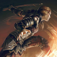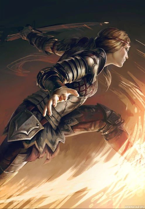 В образе есть женщина-воин или рыцарь в доспехах. Она держит в руках меч и, кажется, находится в движении, возможно, бежит или едет верхом к невидимому месту назначения. На заднем плане присутствуют динамические элементы, такие как пламя и дым, предполагая, что она может вступать в бой или преследовать цель с решимостью.