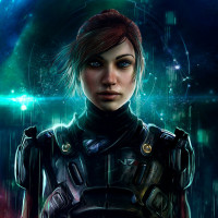 The image features a character from the video game series "Mass Effect." This character is known for her role in the game and her distinctive appearance, which includes a futuristic suit and helmet. The background suggests a sci-fi or space theme, consistent with the setting of the Mass Effect games.