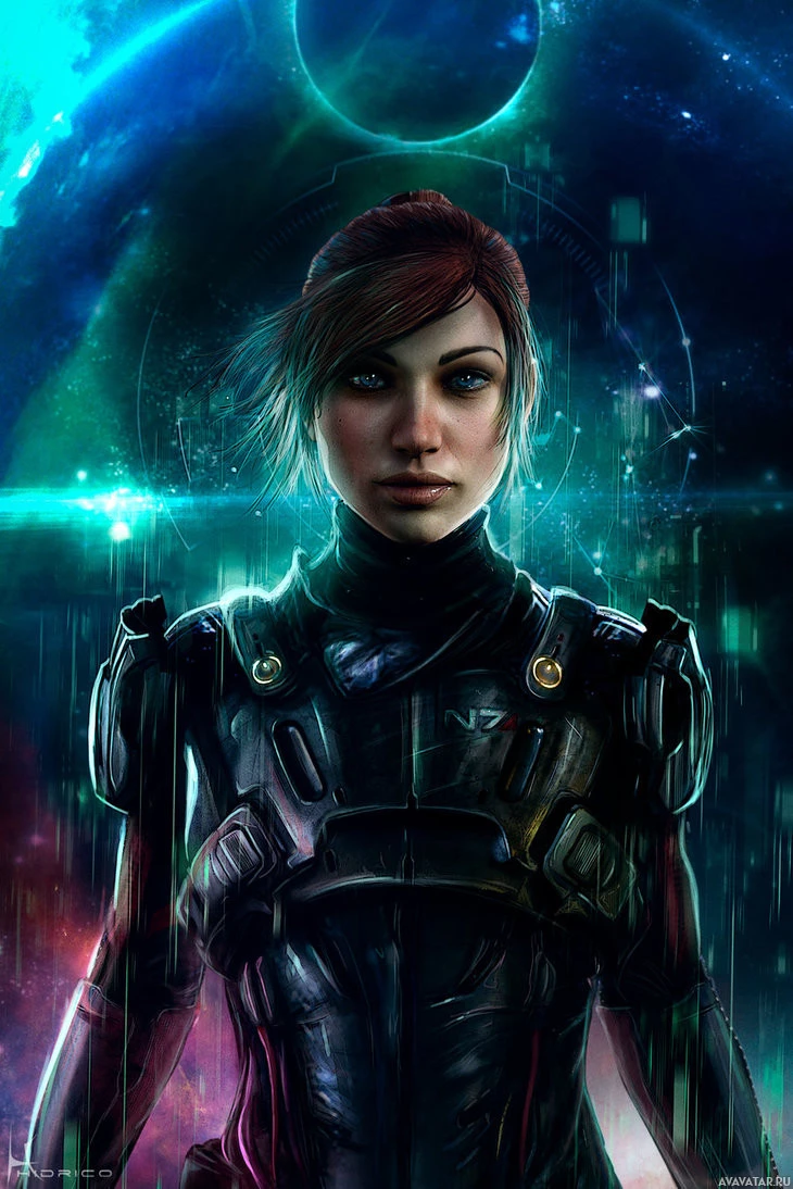 На картинке изображен персонаж из серии видеоигр «Mass Effect». Этот персонаж известен своей ролью в игре и ее отличительной внешностью, которая включает футуристический костюм и шлем. Фон предполагает научно-фантастическую или космическую тему, соответствующую настройкам игр Mass Effect.
