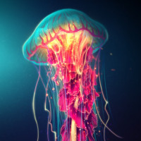 The image displays a stylized illustration of a jellyfish. It has prominent red and purple colors, suggesting vibrant details that might be typical for such