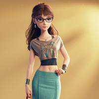 female character with red hair, wearing glasses and stylish casual attire. She has on a black and blue top with an Indian-inspired pattern,