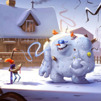 a winter scene where an animated snowman character and a person are standing together. The snowman has a friendly appearance with eyes, a smile, and