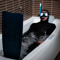 black wetsuit and a flipper on one foot. There are solar panels arranged around the tub, suggesting some form of energy generation or experimentation related to