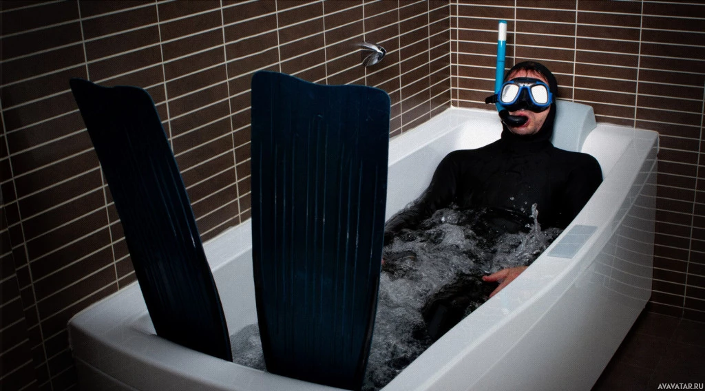 The image shows a person lying inside a bathtub filled with water, wearing a full