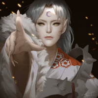a samurai helmet, indicating she might be a warrior or have a role related to combat. Her right hand is extended out towards the viewer, as if reaching for something or communicating with them. The artwork has