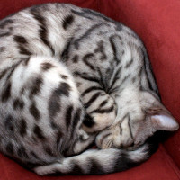 a ball shape. It appears to be resting or possibly sleeping on a red surface, which could be