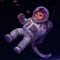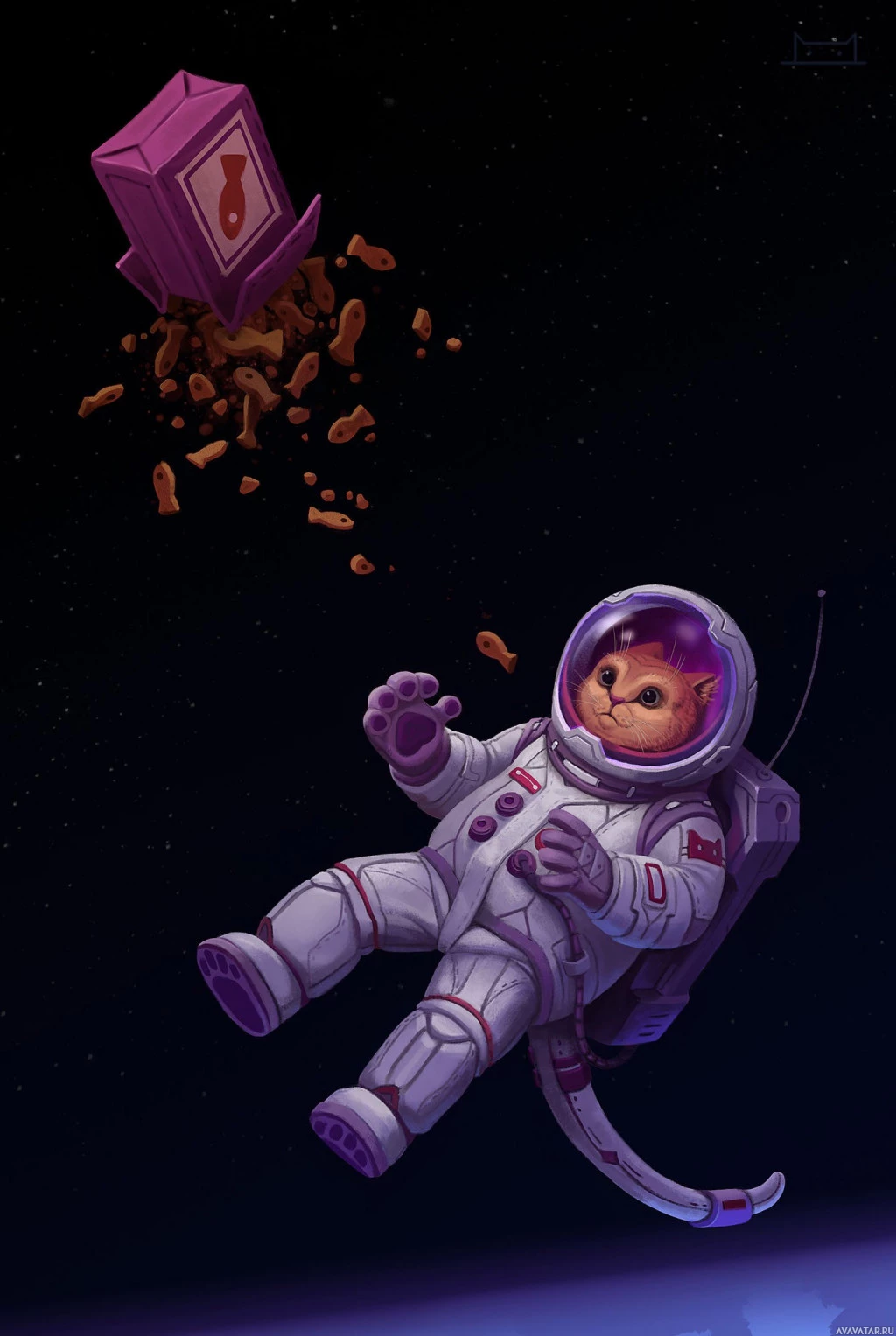 The image shows a stylized illustration of an astronaut, who appears to be a cat wearing