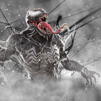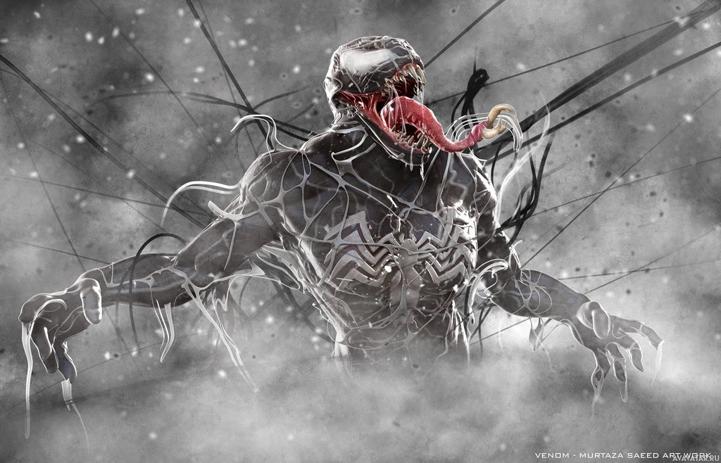 The image features a stylized illustration of the character known as Venom, who is a popular comic