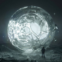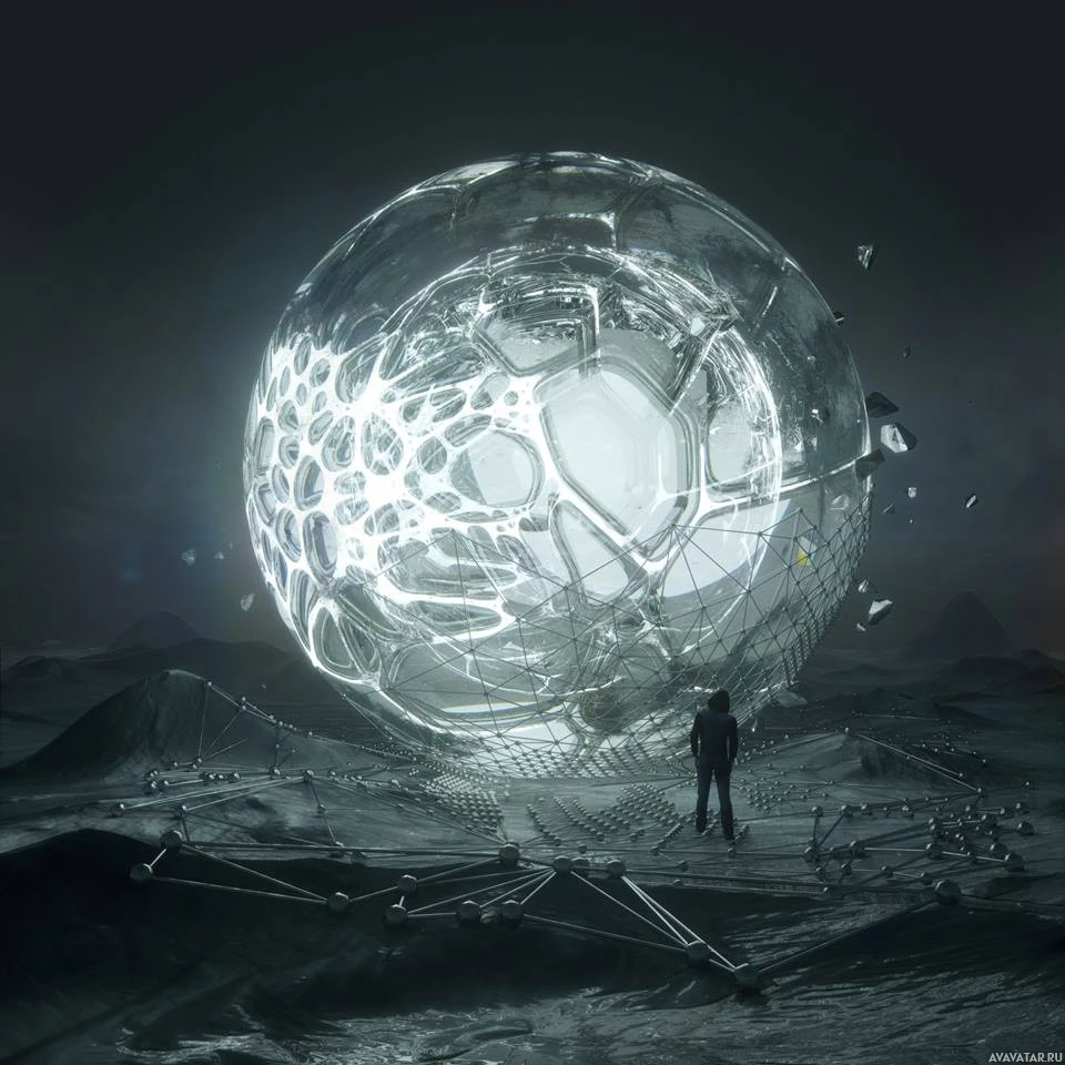 the dark sky with stars visible. There's a person standing beside the sphere, observing it from a distance. The scene gives off