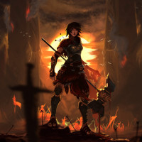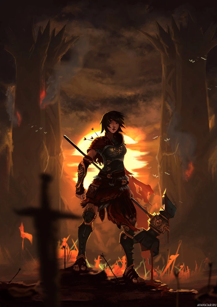 a female warrior, armed with a large axe and standing in what looks like the aftermath of a battle. She has dark hair and is wearing armor, which suggests she may be from a fantasy setting or