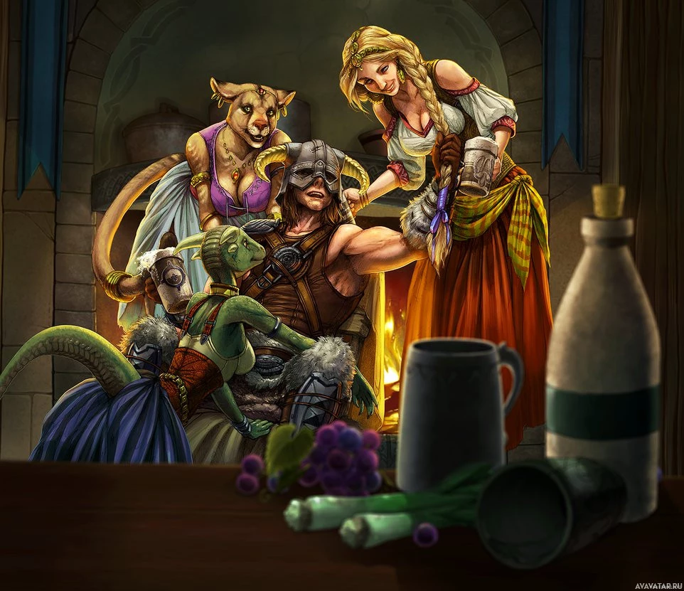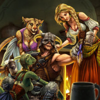 character in armor, holding a staff and a shield, which might suggest a mage or druid role. They are all standing around a table set with various items such as bottles, cups, and what appear to be