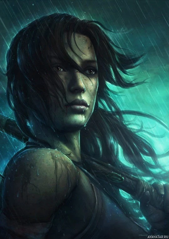 an action pose, suggesting she might be involved in combat or adventure within the game's setting. Her expression is serious and determined. The background hints at a dark and possibly