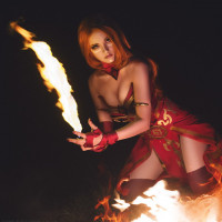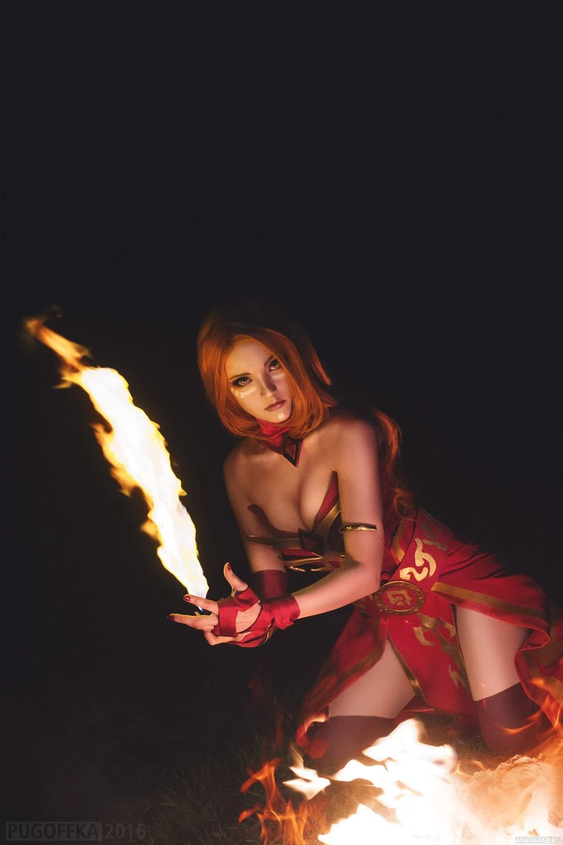 The image depicts a person dressed as Lina, a character from the game Dota 2. She is kneeling in front of