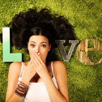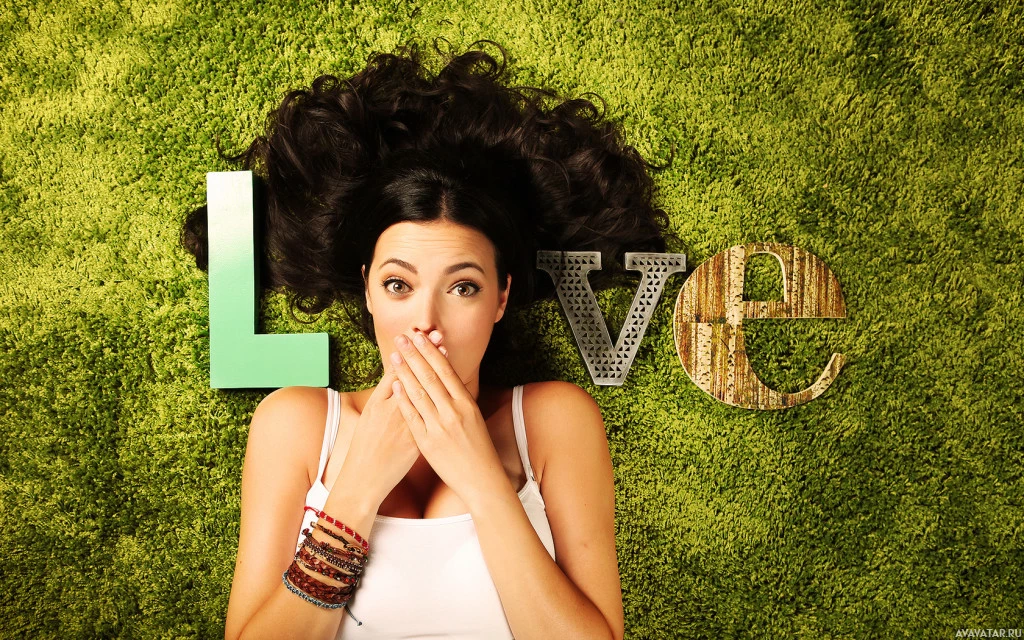The image features a woman lying on her back, looking up at the camera with an expression that seems to convey surprise or excitement. The word "LOVE" is prominently displayed above her in
