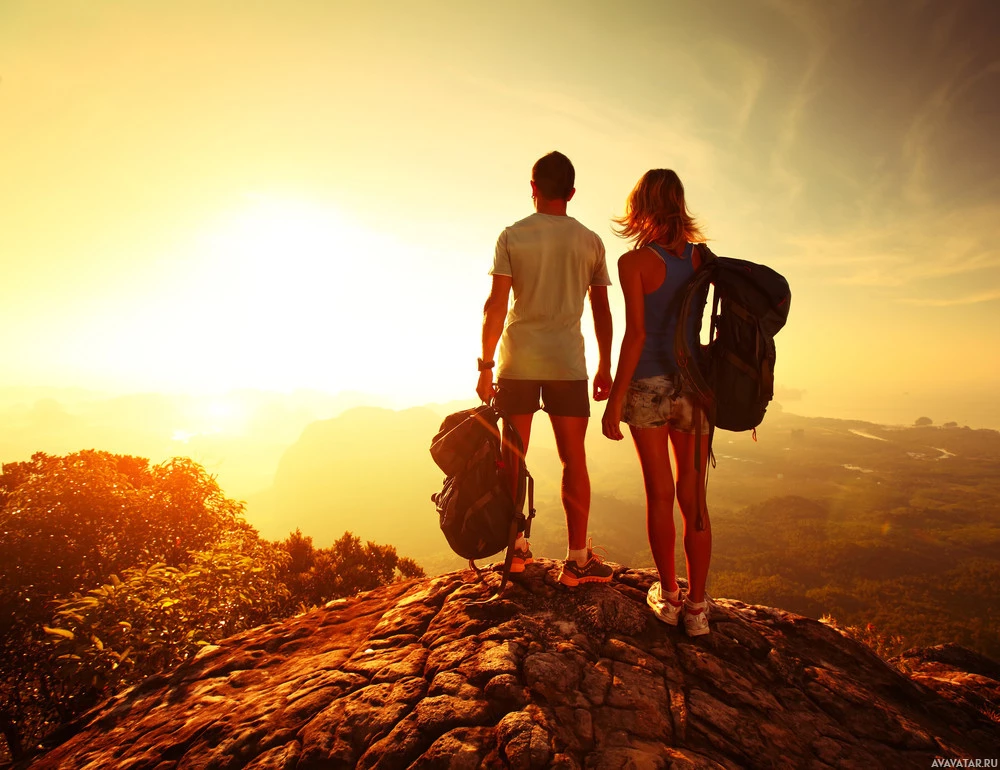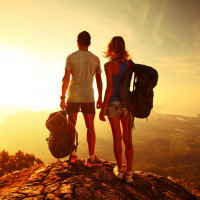 a rocky outcrop, overlooking a sunrise or sunset with mountains in the background. They are equipped for hiking, with backpacks on their shoulders, suggesting they may be on
