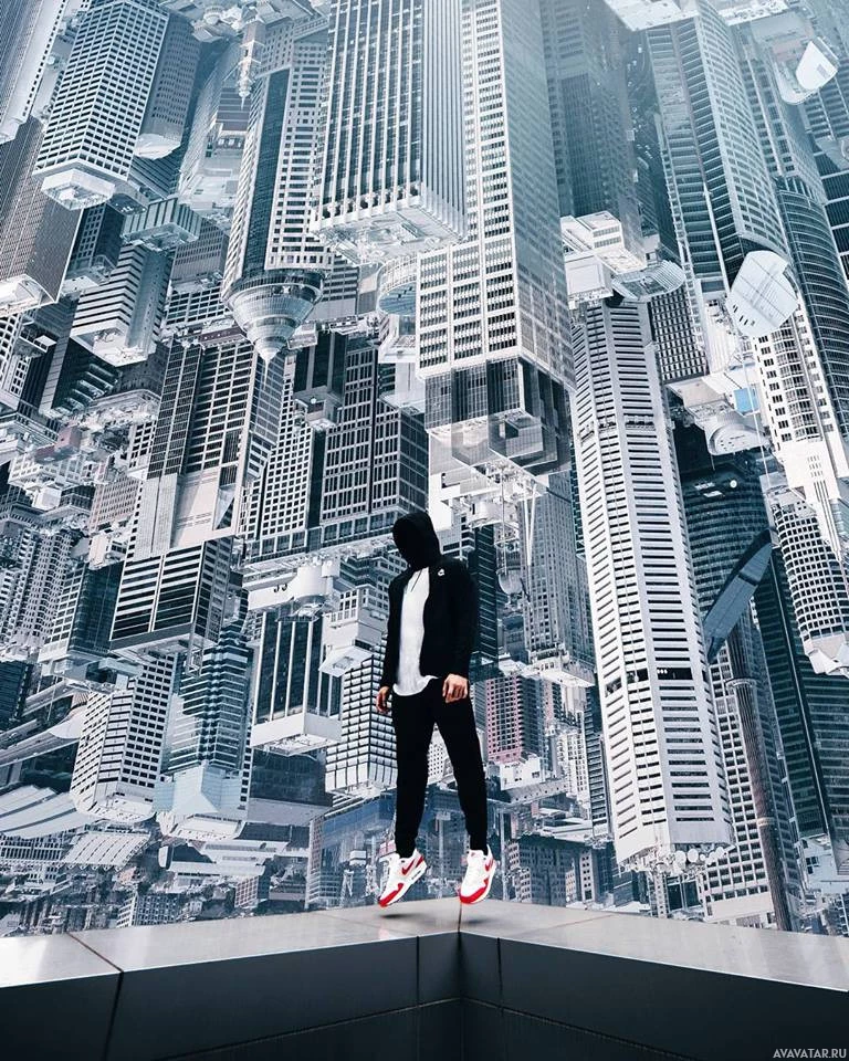 casual clothing with a hood up, and he appears to be gazing out towards the city below. The architecture suggests it could be a city like
