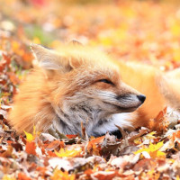 The image shows a fox lying in fallen leaves. It appears to be autumn, as indicated by the presence of leaves on the ground and possibly the color of the leaves being different shades of yellow and orange, which are typical for this season.