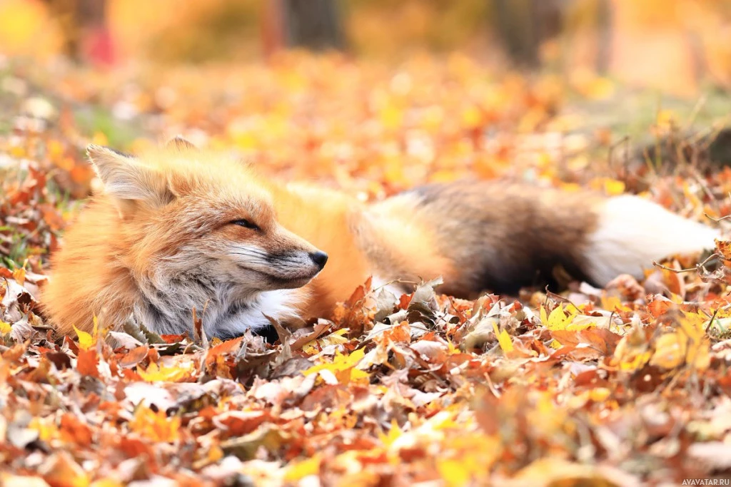 На картинке изображена лиса, лежащая в опавших листьях. Похоже, что это осень, о чем свидетельствует наличие листьев на земле и, возможно, цвет листьев разных оттенков желтого и оранжевого, которые характерны для этого сезона.