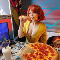 In the image, there is a person who appears to be in cosplay as April from