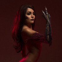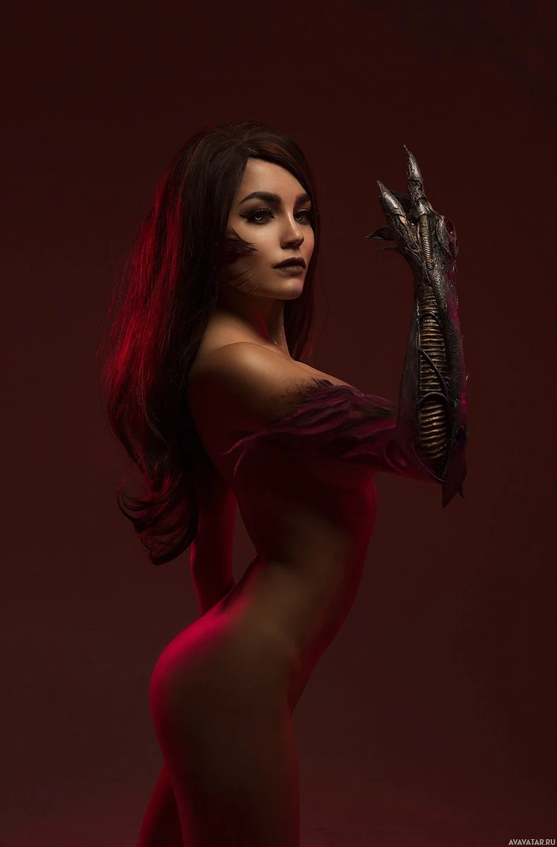 a red background. They appear to be wearing makeup and attire that gives off a fantasy or gothic vibe, with elements like what could be a mask or