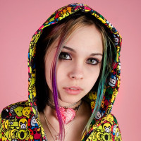 The image shows a young person with short hair, wearing a colorful hoodie with various emoji designs. The individual has multiple piercings and is displaying a neutral expression on their face. The background appears to be a plain wall with a light pinkish-grey tone.