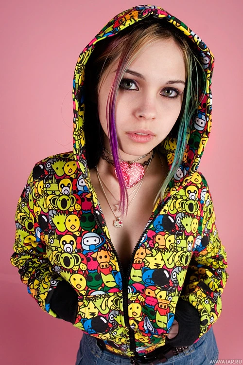 На картинке изображен молодой человек с короткими волосами, одетый в красочную толстовку с различными дизайнами смайликов. Человек имеет несколько пирсингов и демонстрирует нейтральное выражение лица. Фон кажется простой стеной со светло-розово-серым тоном.