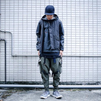 the cargo pockets of their pants or holding onto something not visible in the picture. The setting looks like