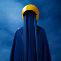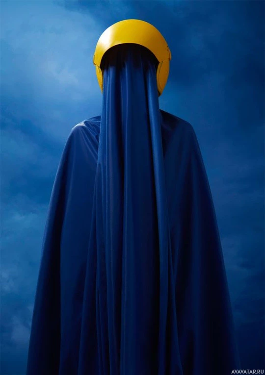 the helmeted figure's face which is obscured by the cape, creating a sense of anonymity or mystery about the identity of the person.