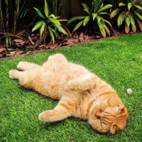 a relaxed position. The cat has orange fur and is situated on