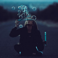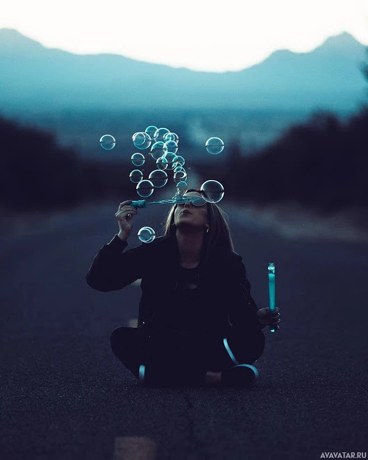 The image shows a person sitting on the side of what appears to be a road. They are surrounded by bubbles and blowing one with a wand, creating an atmosphere that is playful and whimsical. The individual is wearing