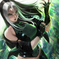 white hair and green accents on her costume, as well as her powers in effect. The background suggests